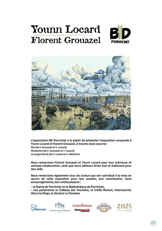 C'est fin 2025 que "Younn LOCARD & Florent GROUAZEL" voit le jour à la Salle d'exposition (Médiathèque de Pornichet). L'occasion pour le public de découvrir la relation entre les deux amis et artistes, ainsi que leurs oeuvres majeures à travers les bandes dessinées Eloi, Révolution et La Longue Route.